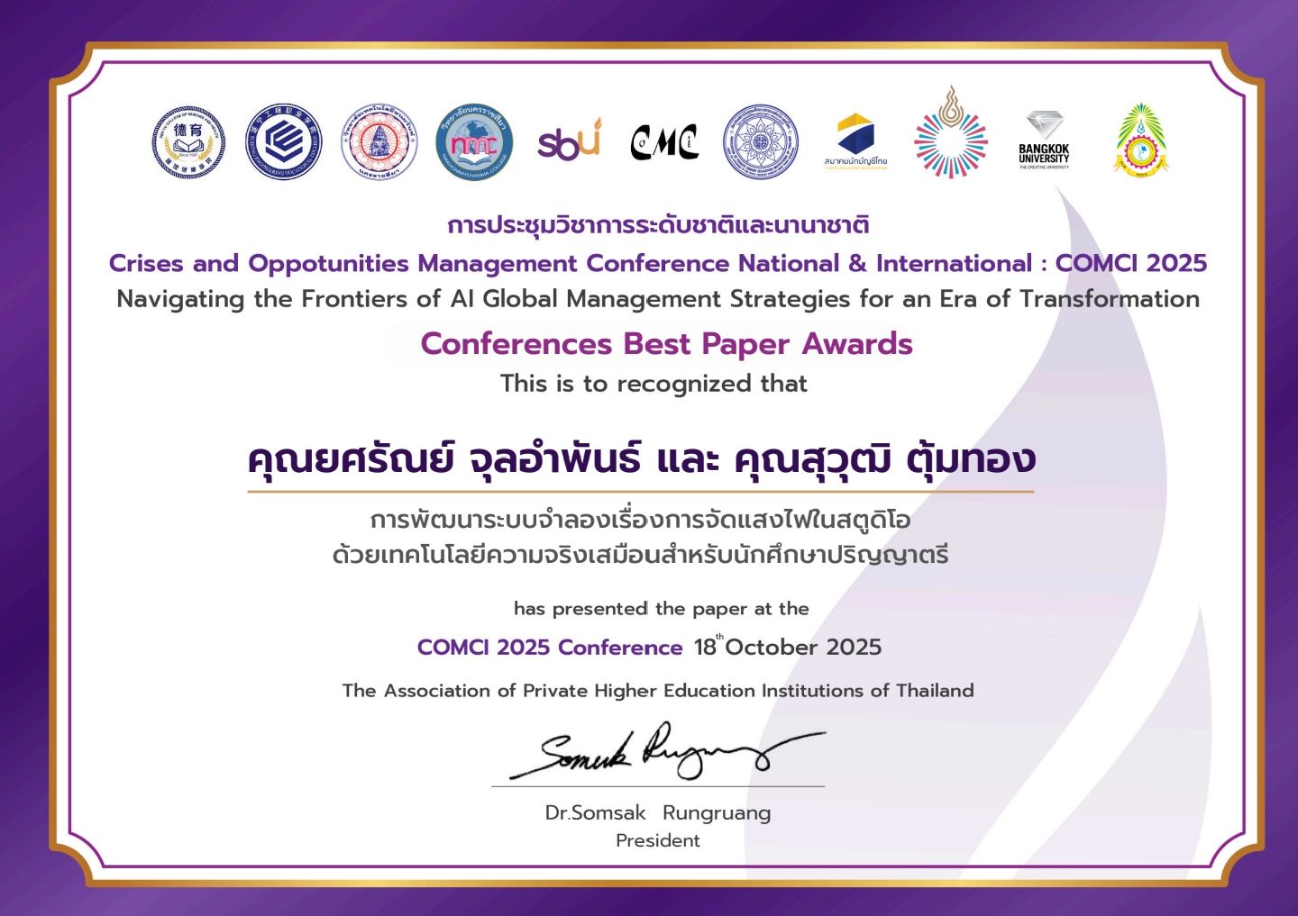 ยศรัณย์ จุลอำพันธ์ และ สุวุฒิ ตุ้มทอง. (2568). การพัฒนาระบบจำลองเรื่องการจัดแสงไฟในสตูดิโอ ด้วยเทคโนโลยีความจริงเสมือนสำหรับนักศึกษาปริญญาตรี. ใน เอกสารสืบเนื่องจากการประชุมวิชาการระดับชาติและนานาชาติ Crises and Opportunities Management Conference National & International ครั้งที่ 5 (COMCI #5) (น. 274-287). มหาวิทยาลัยเซาธ์อีสท์บางกอก.